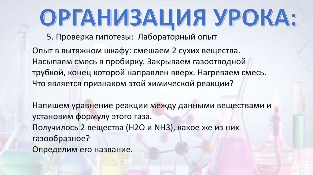5. Проверка гипотезы: Лабораторный опытОпыт в вытяжном шкафу: смешаем 2 сухих вещества.