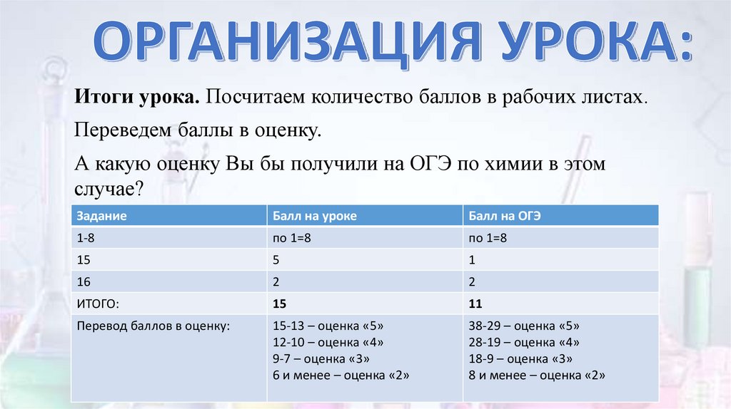 Итоги урока. Посчитаем количество баллов в рабочих листах.Переведем баллы в оценку.
