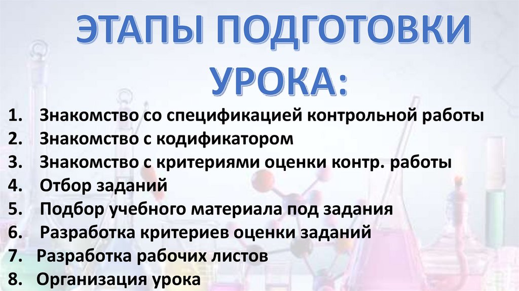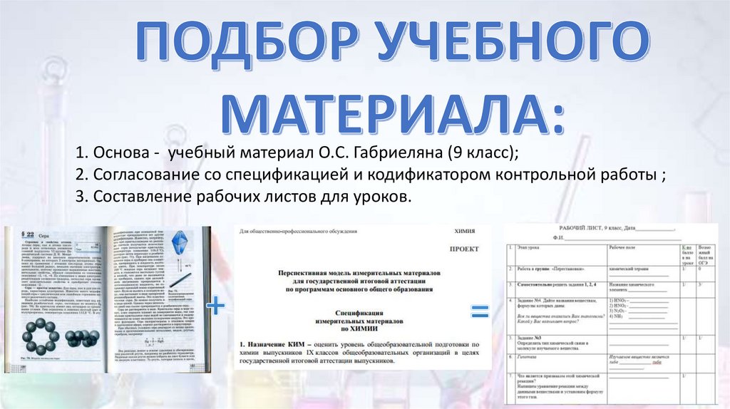 1. Основа - учебный материал О.С. Габриеляна (9 класс);2. Согласование со спецификацией и кодификатором контрольной работы ;