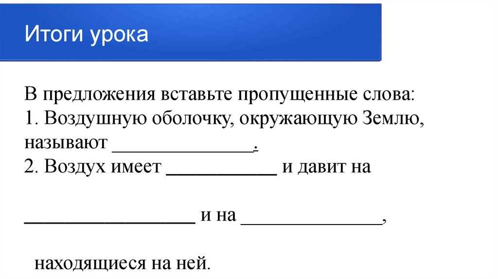 Итоги урокаВ предложения вставьте пропущенные слова: