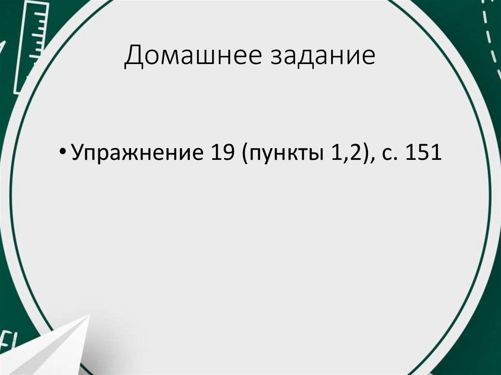 Домашнее задание• Упражнение 19 (пункты 1,2), с. 151