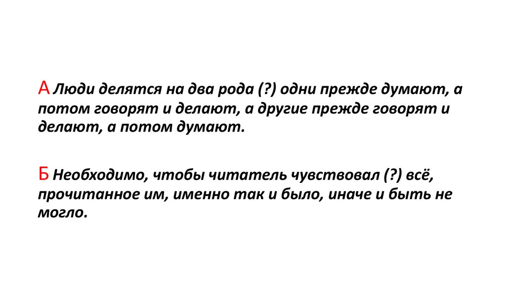 А Люди делятся на два рода (?) одни прежде думают, апотом говорят и делают, а другие прежде говорят и