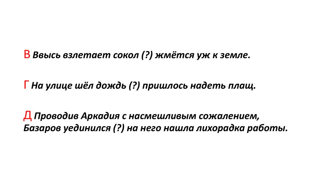 В Ввысь взлетает сокол (?) жмётся уж к земле.Г На улице шёл дождь (?) пришлось надеть плащ.