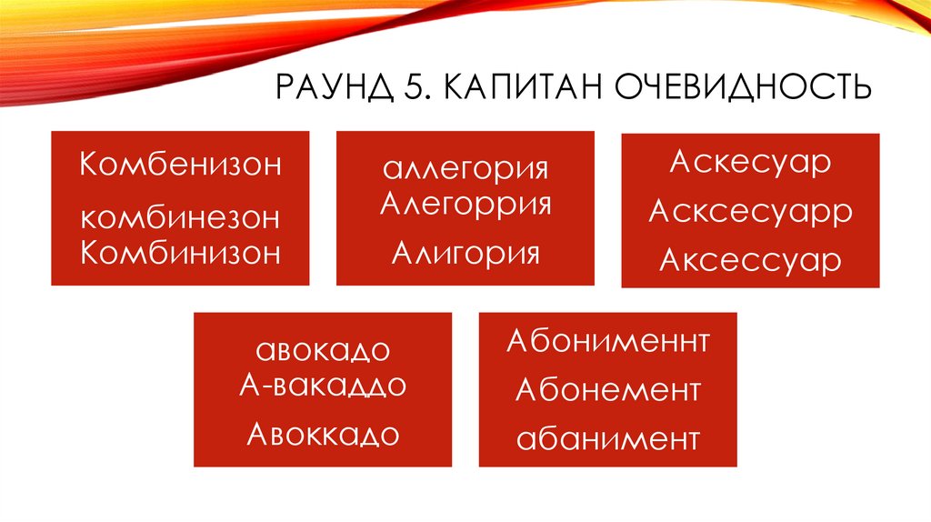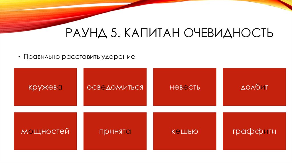 РАУНД 5. КАПИТАН ОЧЕВИДНОСТЬ• Правильно расставить ударение