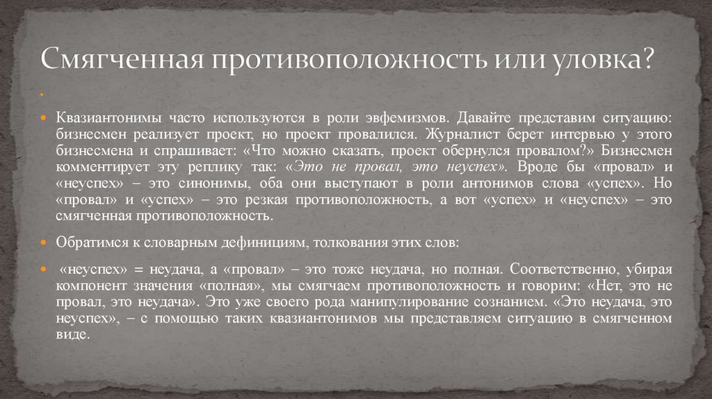 неуспех», – с помощью таких квазиантонимов мы представляем ситуацию в смягченном