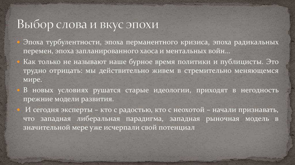 Эпоха турбулентности, эпоха перманентного кризиса, эпоха радикальныхперемен, эпоха запланированного хаоса и ментальных войн…