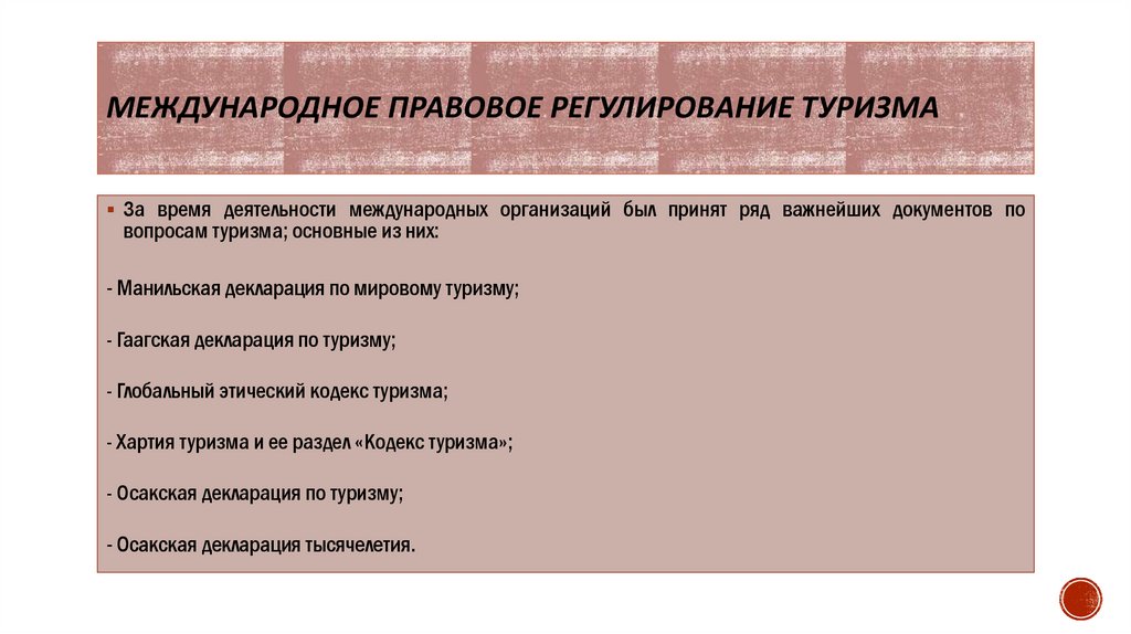 МЕЖДУНАРОДНОЕ ПРАВОВОЕ РЕГУЛИРОВАНИЕ ТУРИЗМАЗа время деятельности международных организаций был принят ряд важнейших документов по