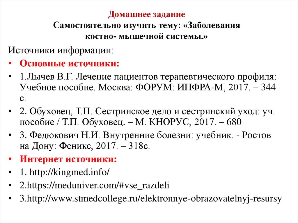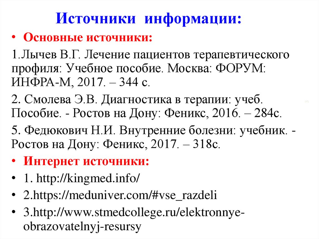 • Основные источники:1.Лычев В.Г. Лечение пациентов терапевтического