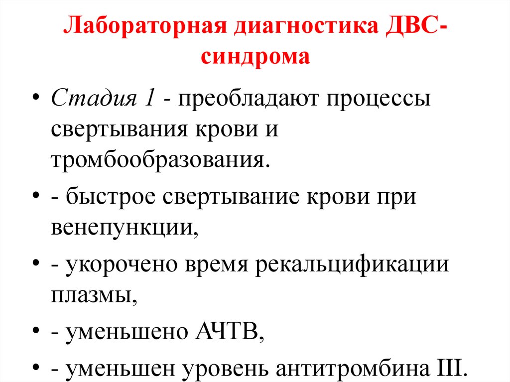 Лабораторная диагностика ДВСсиндрома• Стадия 1 - преобладают процессы