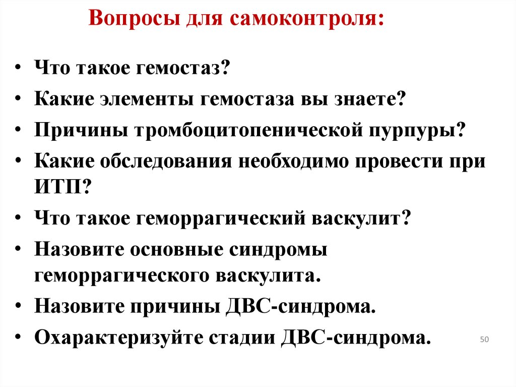 Вопросы для самоконтроля:• Что такое гемостаз?