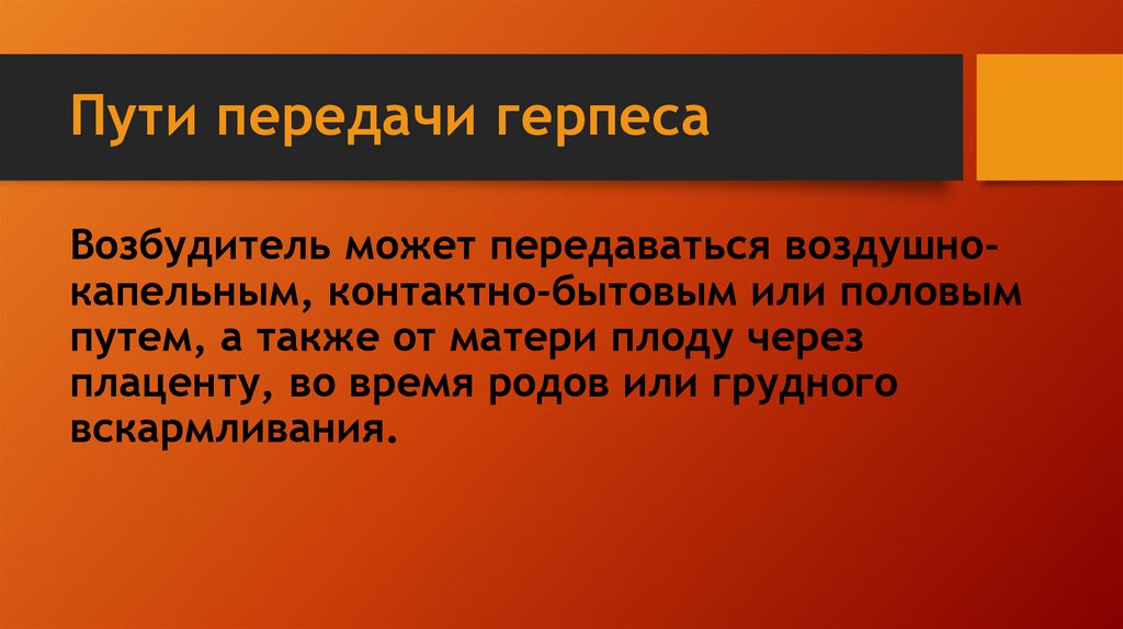 Пути передачи герпесаВозбудитель может передаваться воздушнокапельным, контактно-бытовым или половым