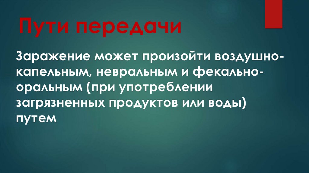 Пути передачиЗаражение может произойти воздушнокапельным, невральным и фекальнооральным (при употреблении