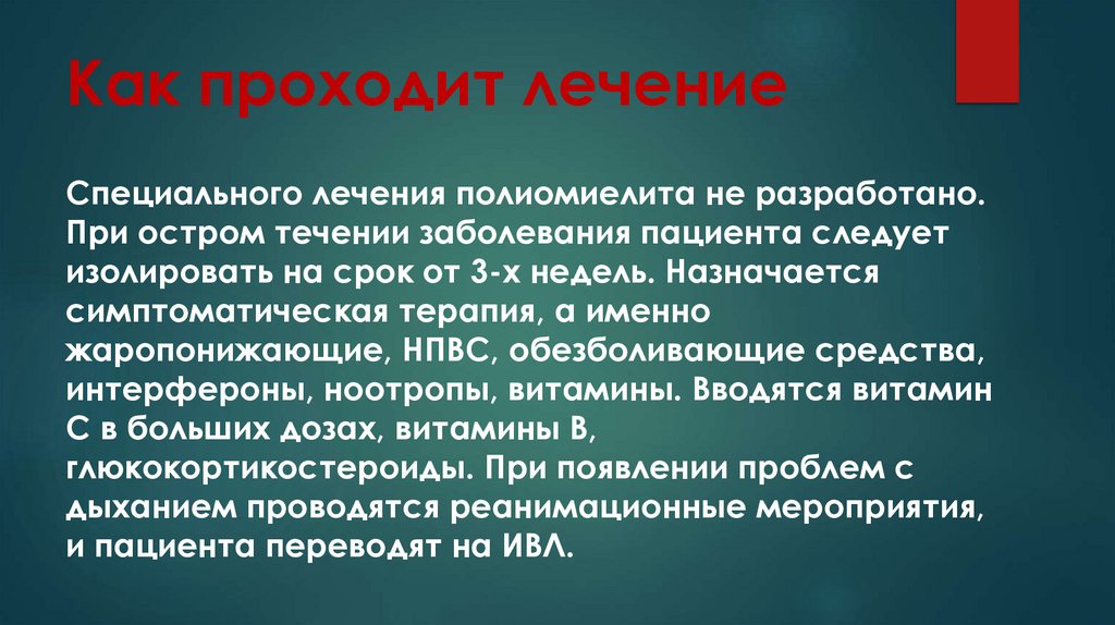 Как проходит лечениеСпециального лечения полиомиелита не разработано.