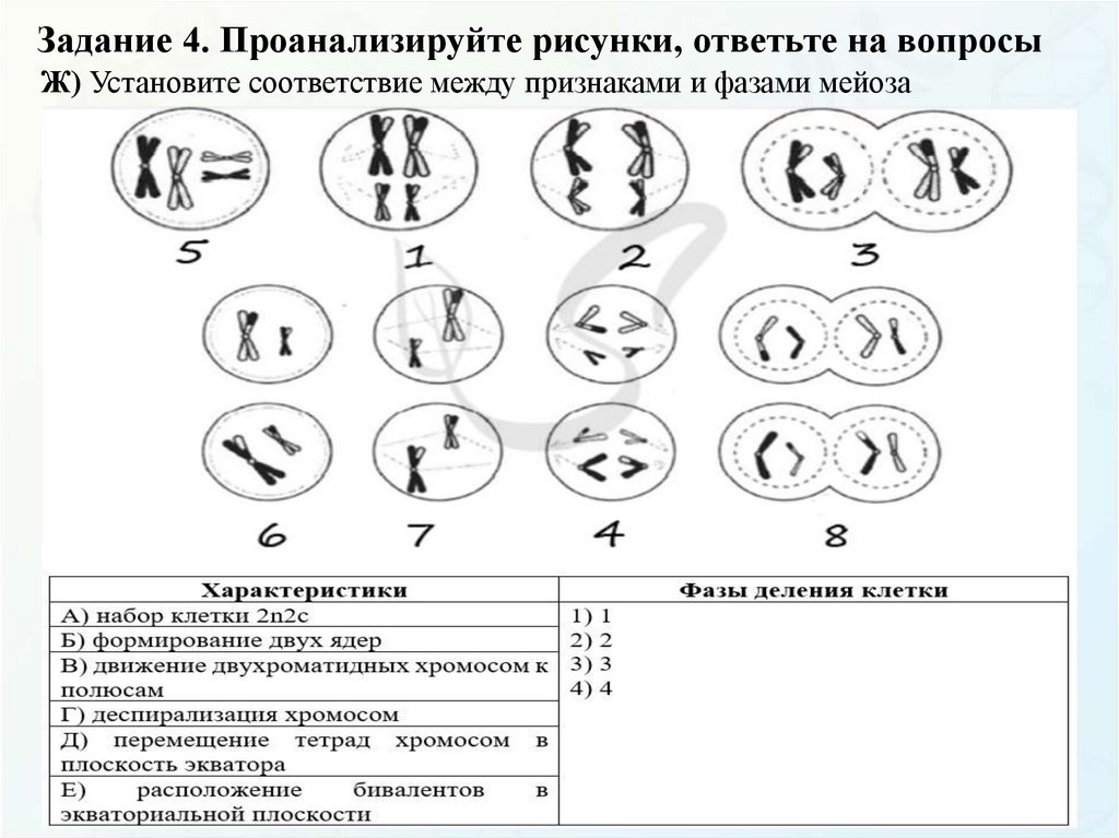 Задание 4. Проанализируйте рисунки, ответьте на вопросыЖ) Установите соответствие между признаками и фазами мейоза