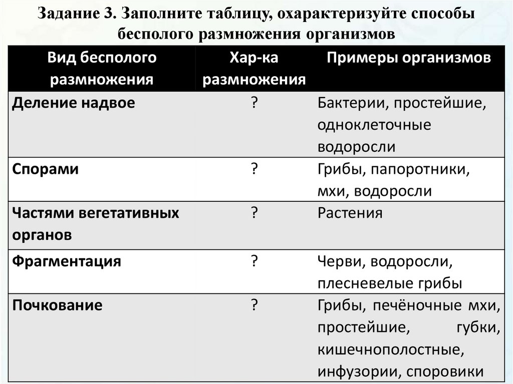 Задание 3. Заполните таблицу, охарактеризуйте способыбесполого размножения организмов