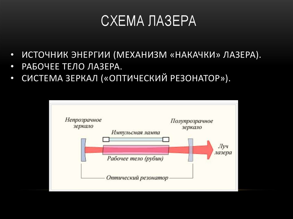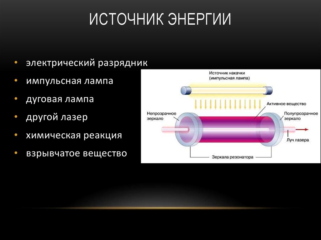 СХЕМА ЛАЗЕРА• ИСТОЧНИК ЭНЕРГИИ (МЕХАНИЗМ «НАКАЧКИ» ЛАЗЕРА).