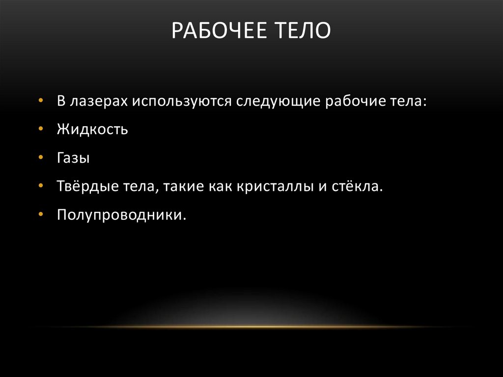 РАБОЧЕЕ ТЕЛО• В лазерах используются следующие рабочие тела:
