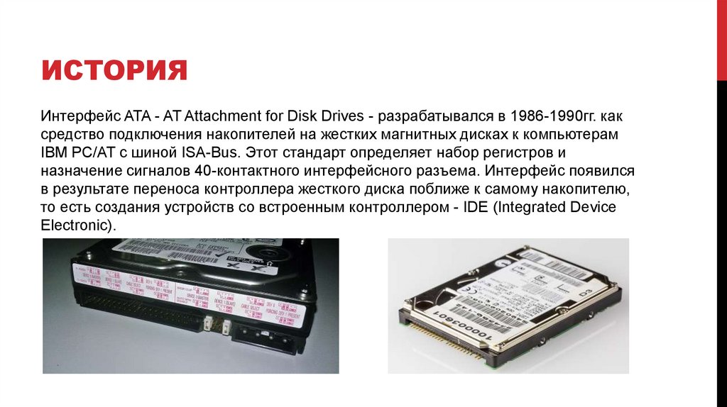 ИСТОРИЯИнтерфейс ATA - AT Attachment for Disk Drives - разрабатывался в 1986-1990гг. как