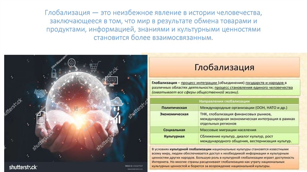 Глобализация — это неизбежное явление в истории человечества,заключающееся в том, что мир в результате обмена товарами и