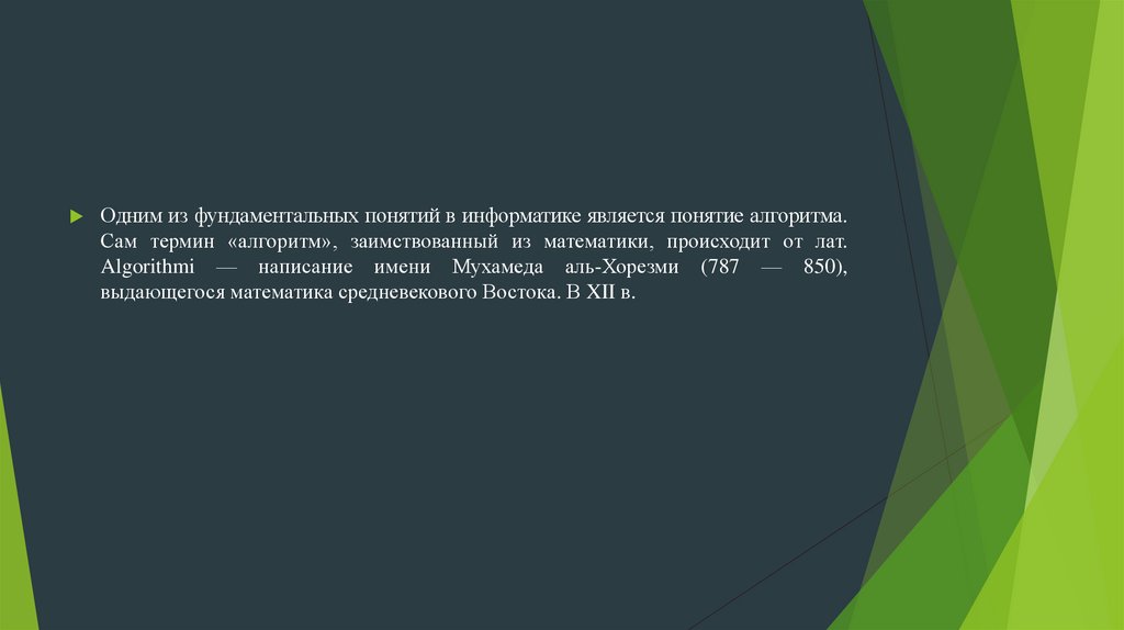Одним из фундаментальных понятий в информатике является понятие алгоритма.Сам термин «алгоритм», заимствованный из математики, происходит от лат.
