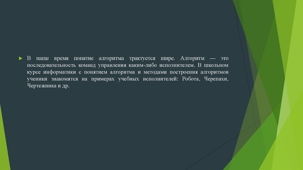 В наше время понятие алгоритма трактуется шире. Алгоритм — этопоследовательность команд управления каким-либо исполнителем. В школьном
