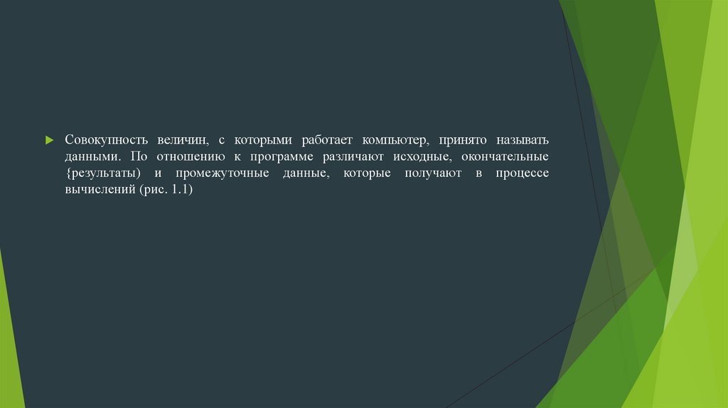 Совокупность величин, с которыми работает компьютер, принято называтьданными. По отношению к программе различают исходные, окончательные