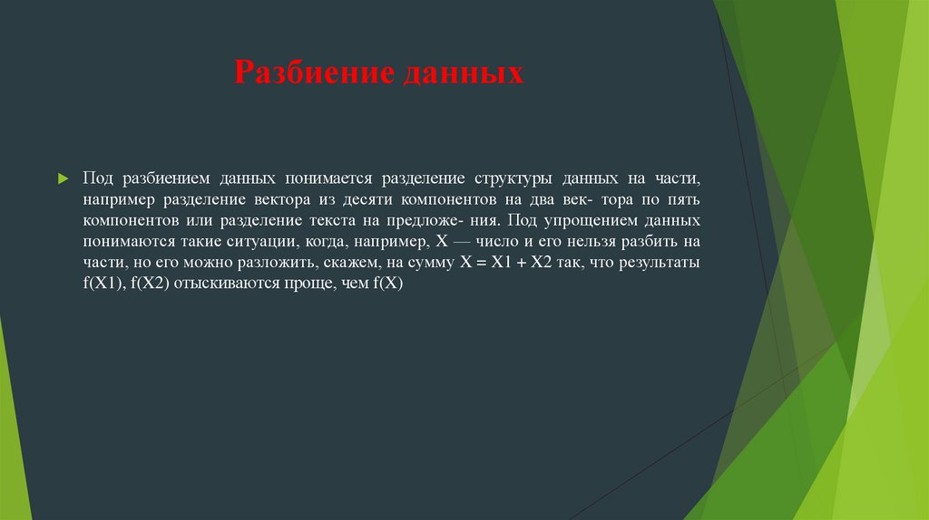 Разбиение данныхПод разбиением данных понимается разделение структуры данных на части,