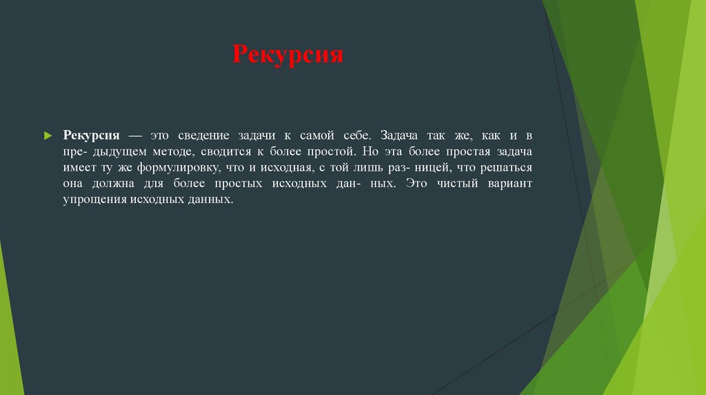 РекурсияРекурсия — это сведение задачи к самой себе. Задача так же, как и в