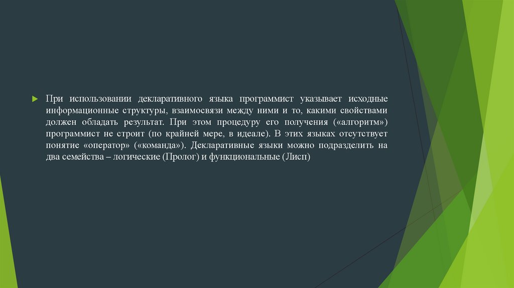 При использовании декларативного языка программист указывает исходныеинформационные структуры, взаимосвязи между ними и то, какими свойствами