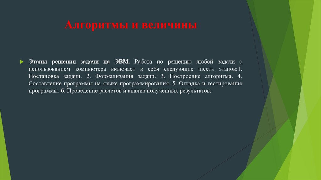 Алгоритмы и величиныЭтапы решения задачи на ЭВМ. Работа по решению любой задачи с