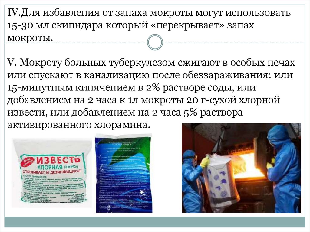 V. Мокроту больных туберкулезом сжигают в особых печах