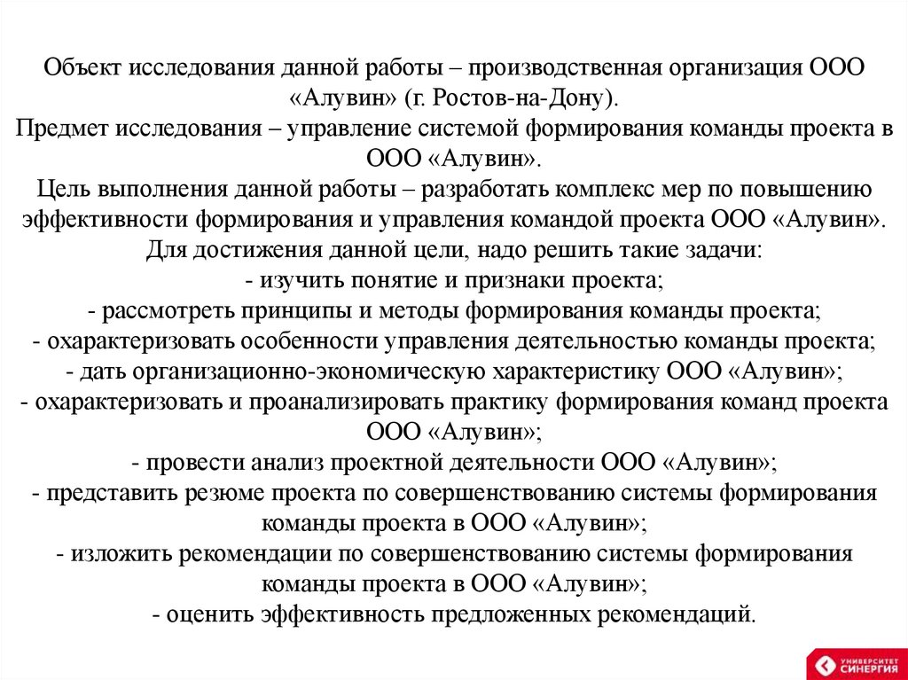 Объект исследования данной работы – производственная организация ООО«Алувин» (г. Ростов-на-Дону).
