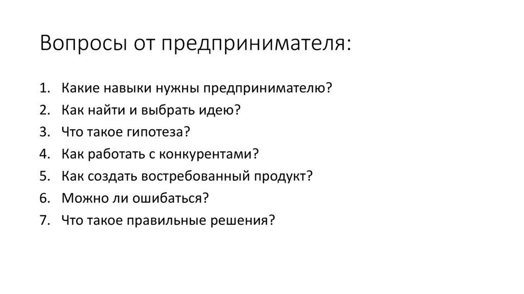 Вопросы от предпринимателя:1. Какие навыки нужны предпринимателю?