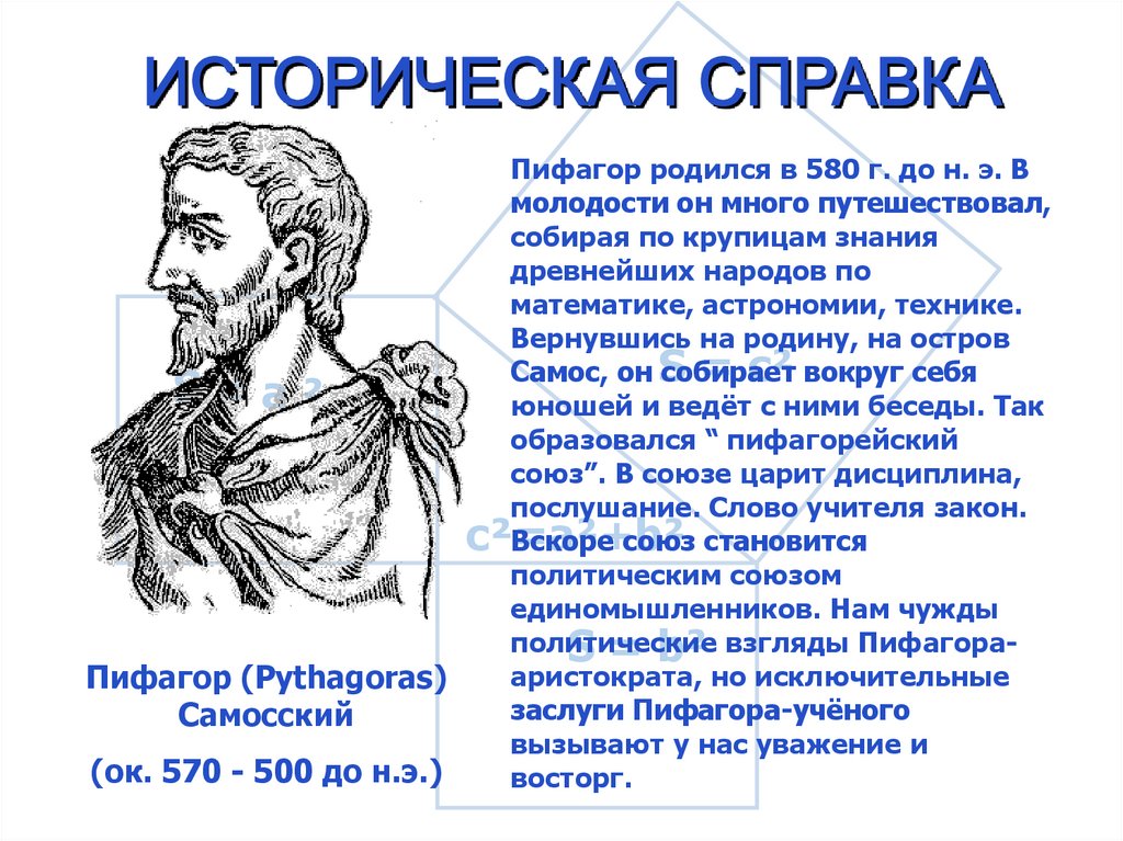 Пифагор родился в 580 г. до н. э. Вмолодости он много путешествовал,