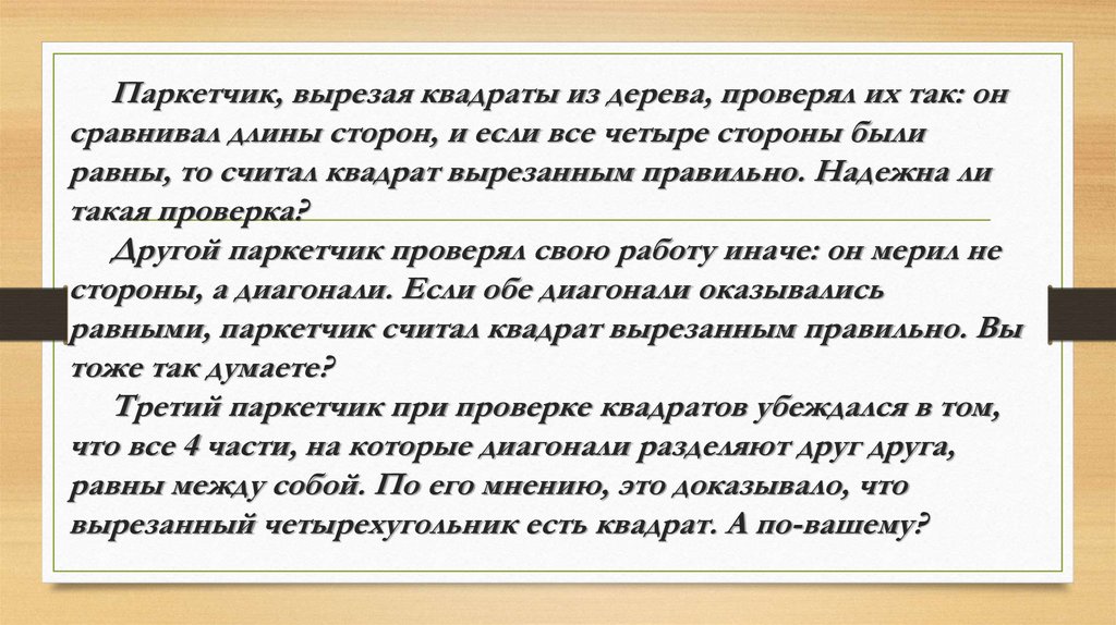 Паркетчик, вырезая квадраты из дерева, проверял их так: онсравнивал длины сторон, и если все четыре стороны были