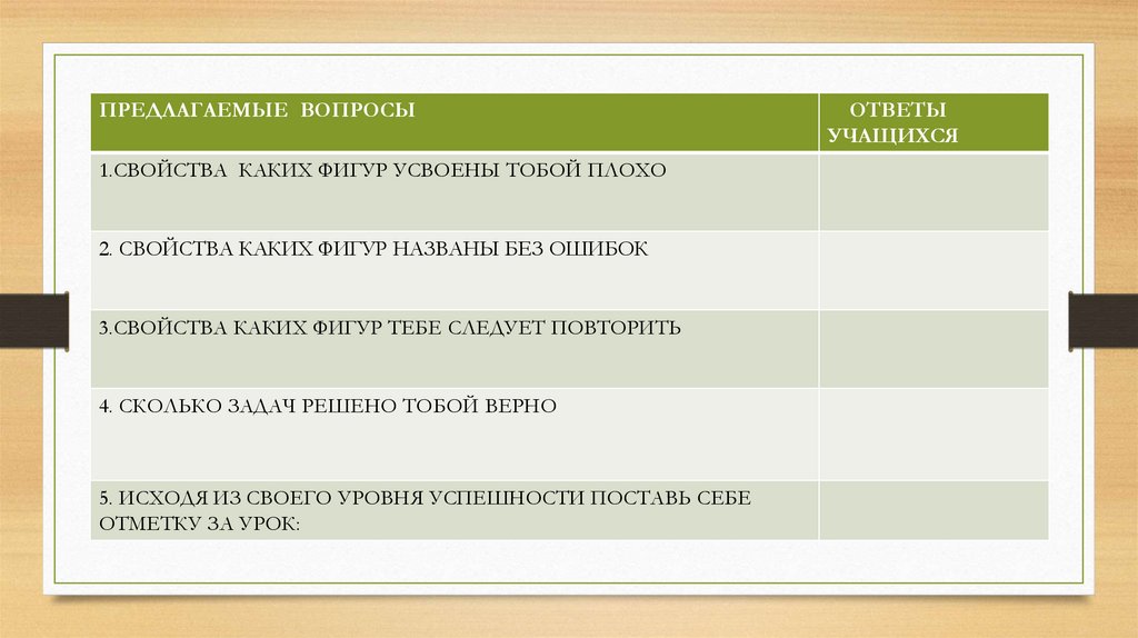 ПРЕДЛАГАЕМЫЕ ВОПРОСЫ1.СВОЙСТВА КАКИХ ФИГУР УСВОЕНЫ ТОБОЙ ПЛОХО