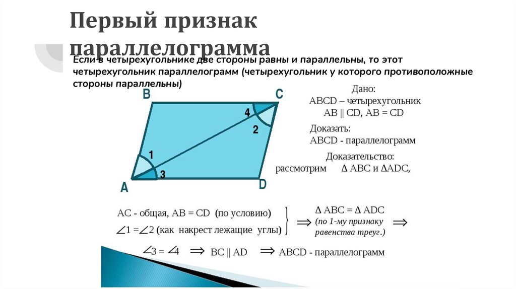 Если в четырехугольнике две стороны равны и параллельны, то этот