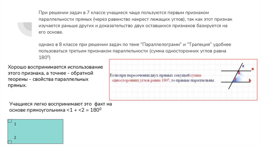 При решении задач в 7 классе учащиеся чаще пользуются первым признакомпараллельности прямых (через равенство накрест лежащих углов), так как этот признак