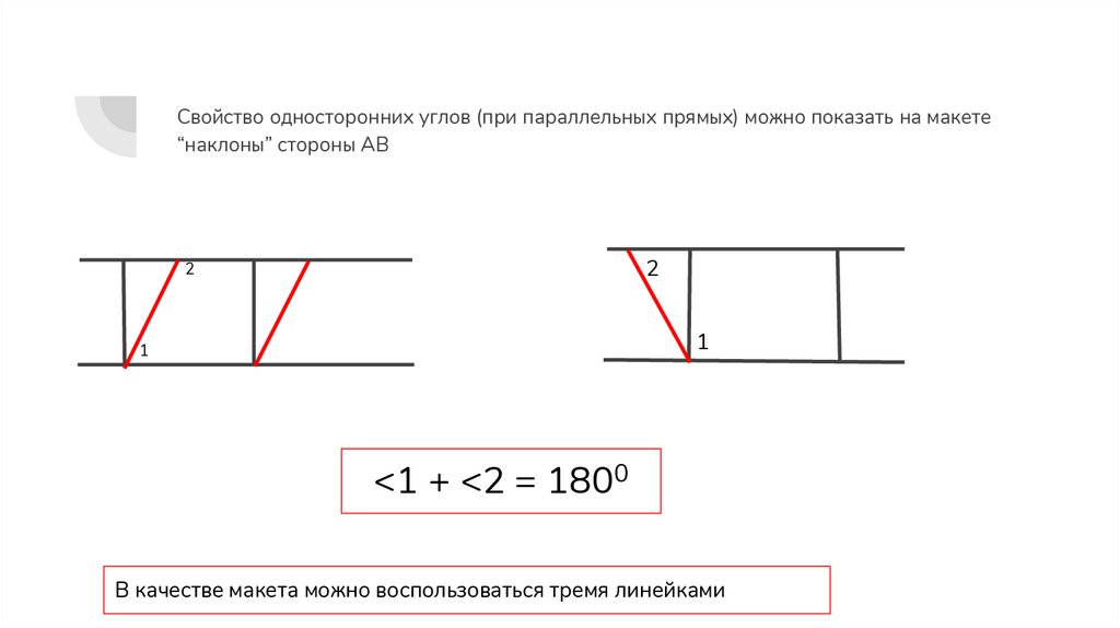 Свойство односторонних углов (при параллельных прямых) можно показать на макете“наклоны” стороны AB