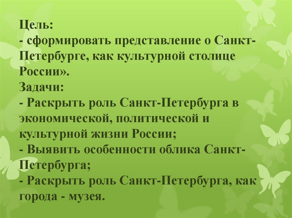 Цель:- сформировать представление о СанктПетербурге, как культурной столице