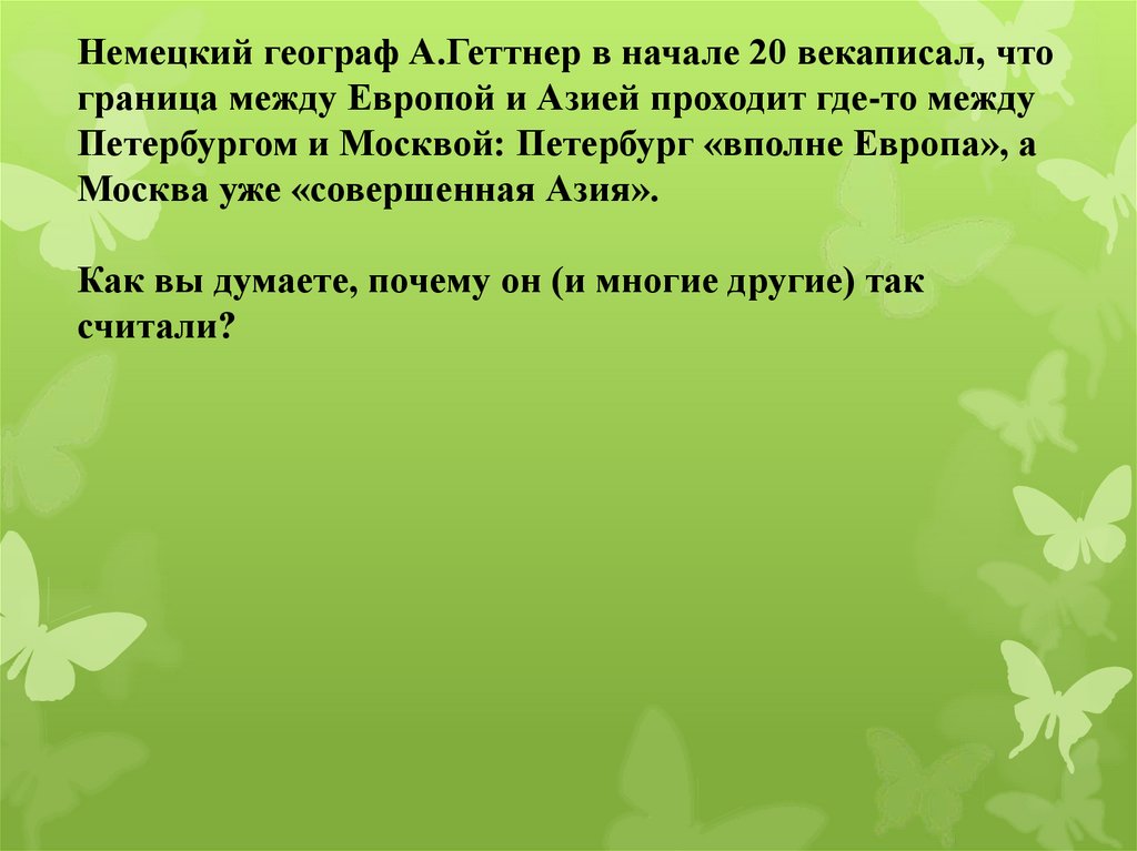 Немецкий географ А.Геттнер в начале 20 векаписал, чтограница между Европой и Азией проходит где-то между