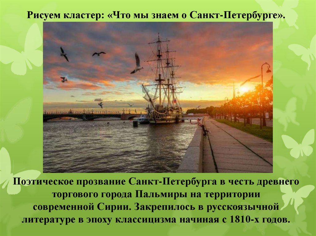 Рисуем кластер: «Что мы знаем о Санкт-Петербурге».Поэтическое прозвание Санкт-Петербурга в честь древнего