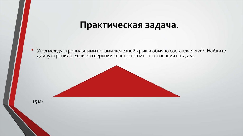 Практическая задача.Угол между стропильными ногами железной крыши обычно составляет 120°. Найдите