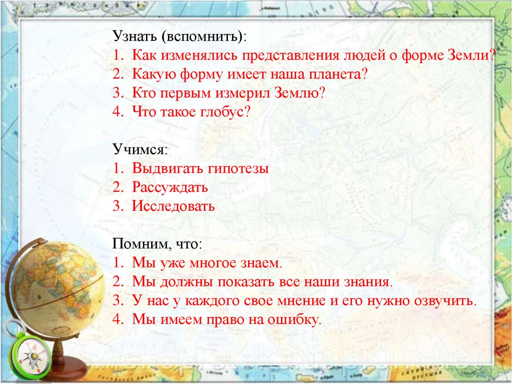 Узнать (вспомнить):1. Как изменялись представления людей о форме Земли?