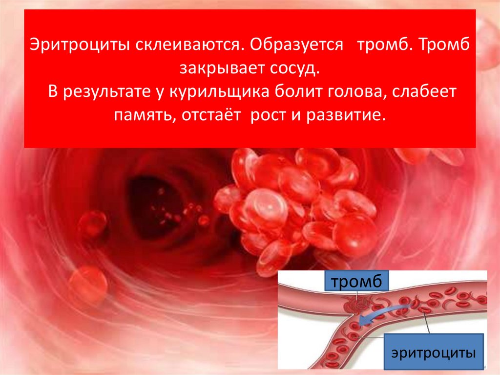 Эритроциты склеиваются. Образуется тромб. Тромбзакрывает сосуд.