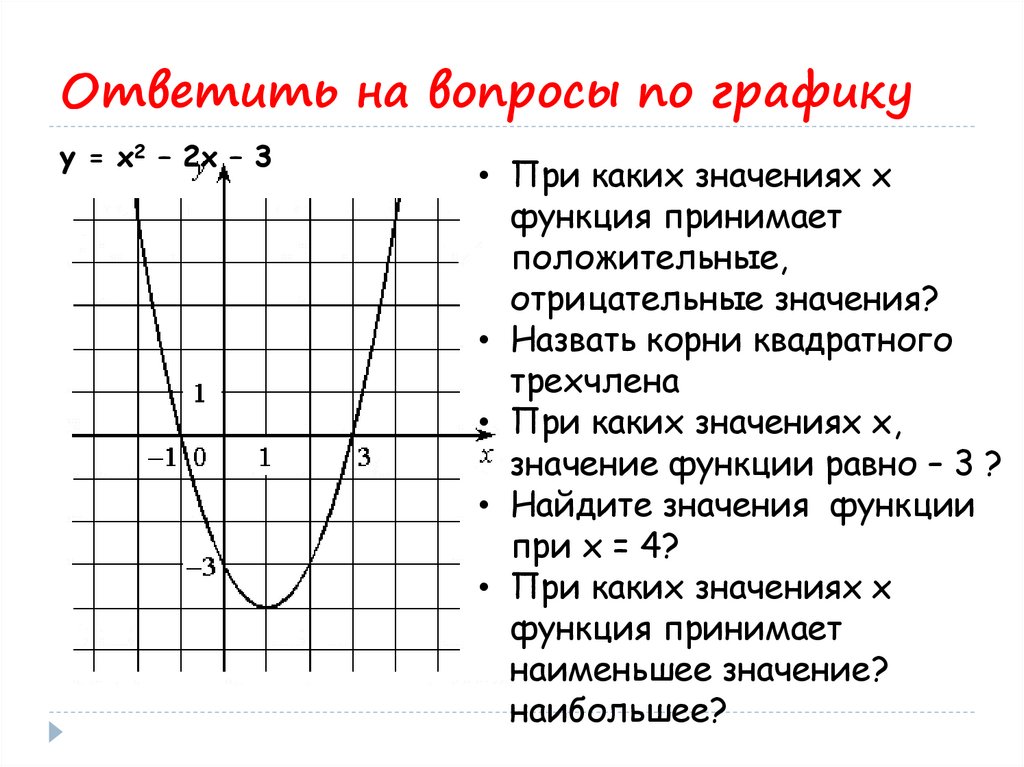 Ответить на вопросы по графикуу = х2 – 2х – 3