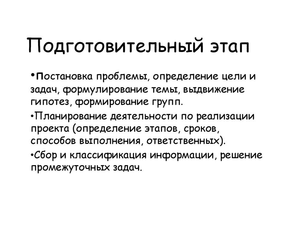Подготовительный этап•постановка проблемы, определение цели и