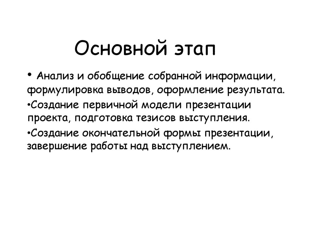 Основной этапАнализ и обобщение собранной информации,