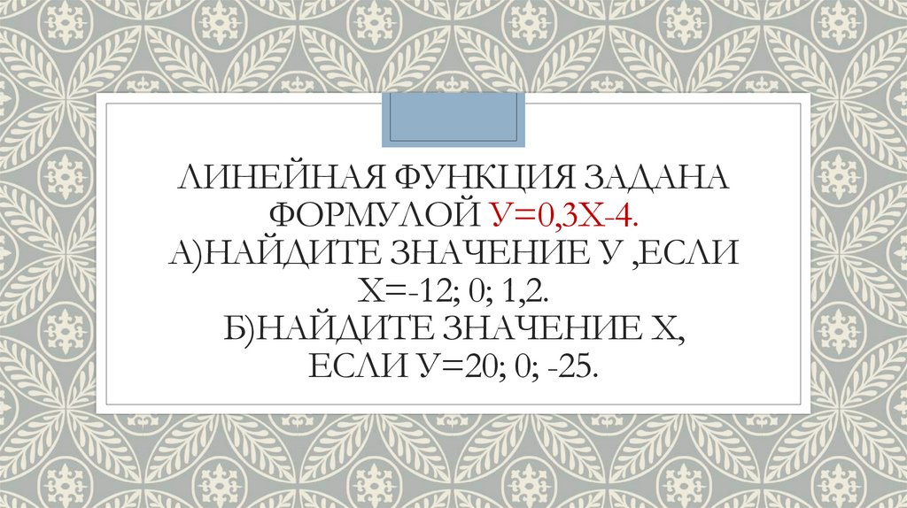 ЛИНЕЙНАЯ ФУНКЦИЯ ЗАДАНАФОРМУЛОЙ У=0,3Х-4.