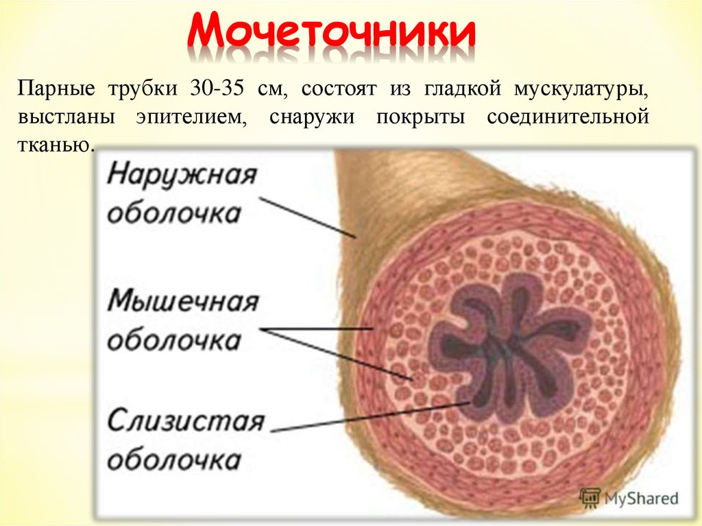 МочеточникиПарные трубки 30-35 см, состоят из гладкой мускулатуры,